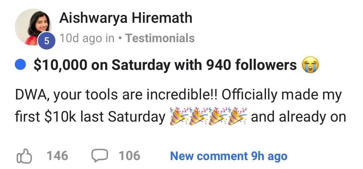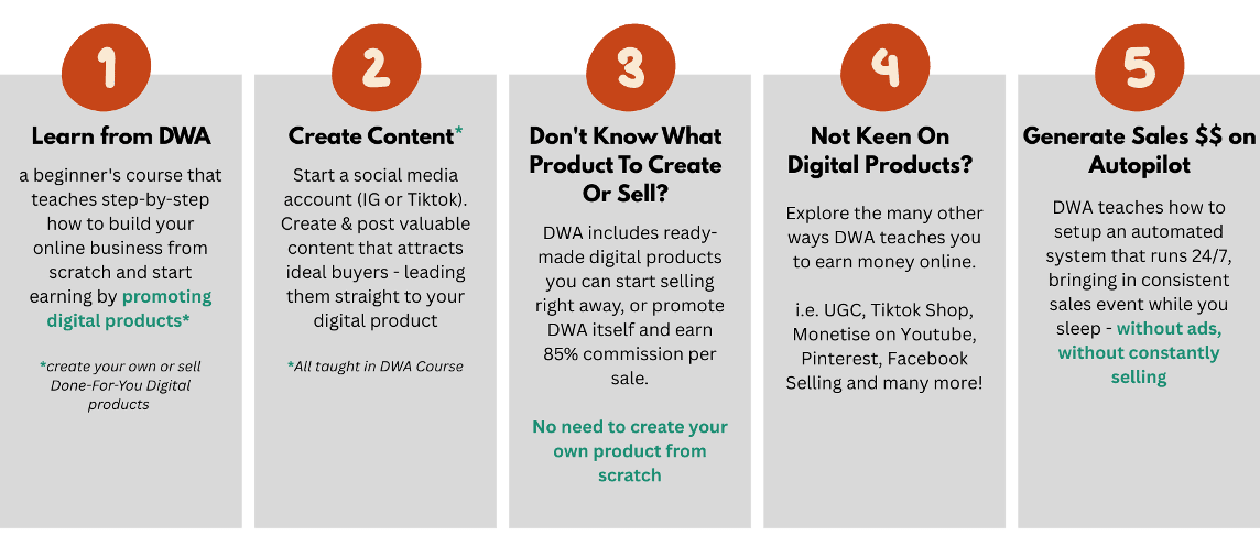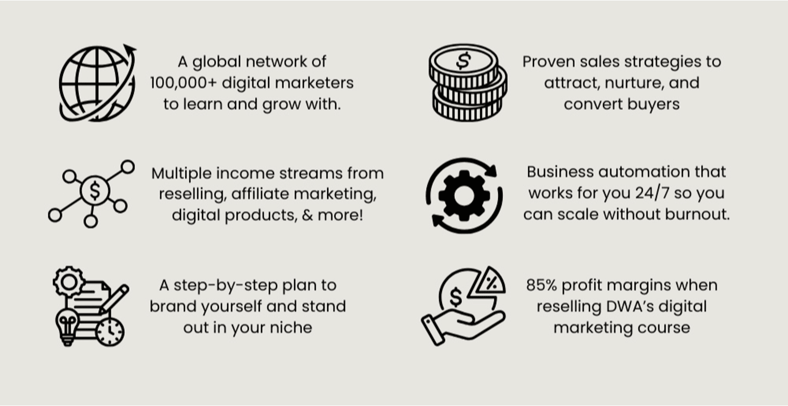 DWA provides step-by-step guidance from content creation to building automated sales systems, helping you to launch, grow, and scale — all from scratch.